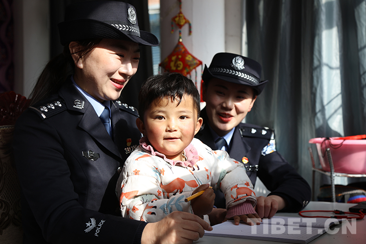 圖為(wei) 聶拉木出入境邊防檢查站女民警為(wei) 康珠小朋友輔導寫(xie) 字並為(wei) 其送上藏曆新年祝福 攝影:索朗次仁
