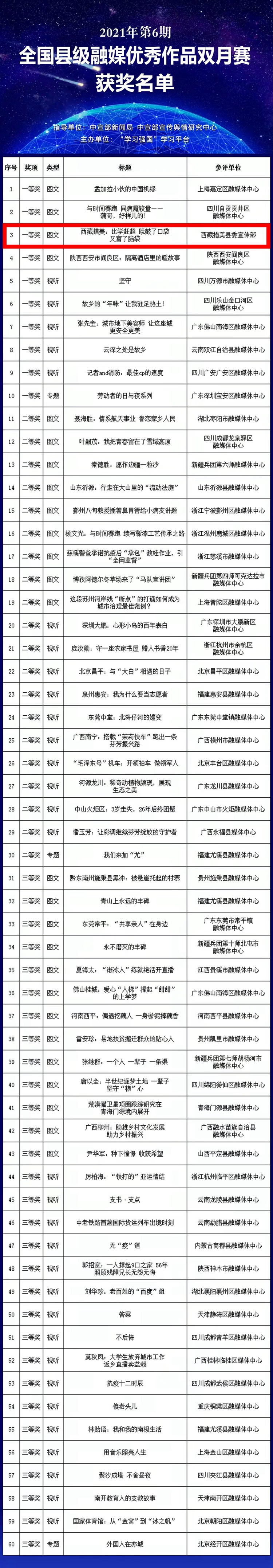 據了解,2021年第6期全國縣級融媒體(ti) 中心優(you) 秀作品雙月賽由中宣部新聞局、中宣部宣傳(chuan) 輿情研究中心指導,“學習(xi) 強國”學習(xi) 平台主辦,各省(區、市)和新疆生產(chan) 建設兵團學習(xi) 平台協助組織、共同實施,各省級學習(xi) 平台對投稿作品進行初評,評選出299件優(you) 秀作品,“學習(xi) 強國”學習(xi) 平台組織專(zhuan) 家評審團隊對優(you) 秀作品進行複評、終評,最終評選出60件獲獎作品。
