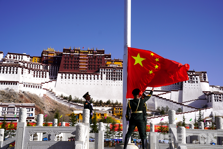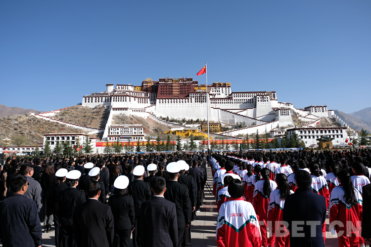 新利平台訊 3月28日上午,西藏自治區首府拉薩市風和日麗(li) ,1000餘(yu) 名各族各界群眾(zhong) 聚集在布達拉宮廣場,隆重舉(ju) 行“升國旗、唱國歌”儀(yi) 式,慶祝西藏百萬(wan) 農(nong) 奴解放63周年。