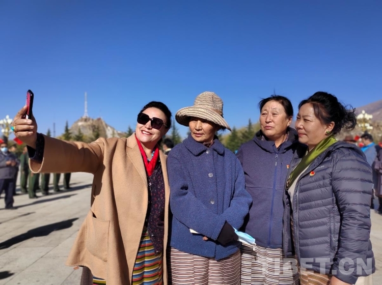 圖為(wei) 參加“升國旗、唱國歌”儀(yi) 式的群眾(zhong) 拍照留念 攝影:拉姆