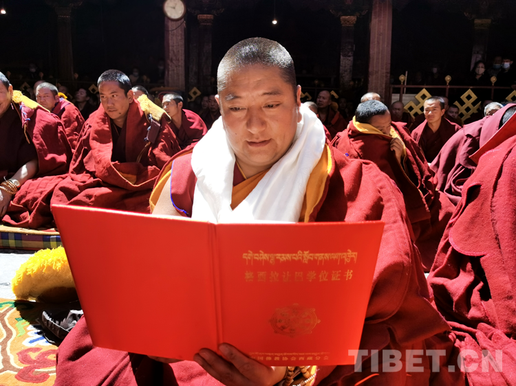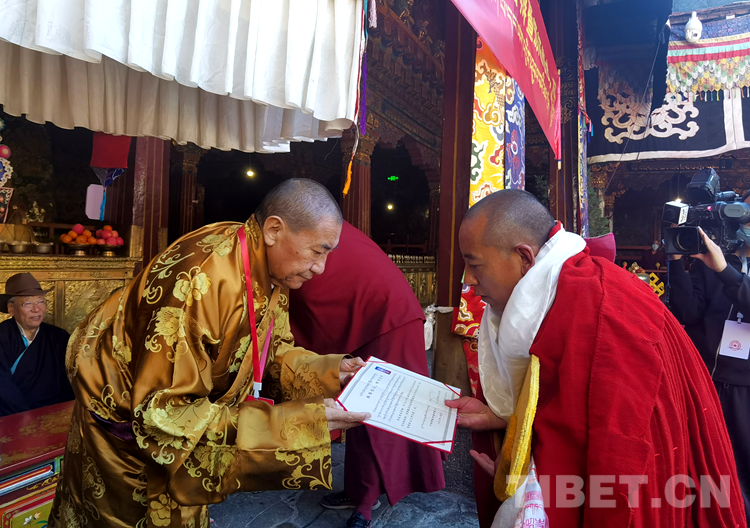 活動現場,西藏自治區人民政府副秘書(shu) 長馬立柱代表西藏自治區人民政府向獲得學位的考僧贈送五彩緞、幹果、袈裟和禮金;西藏自治區宗教局副局長達娃窮達向參加答辯活動的僧人發放布施;中國佛教協會(hui) 西藏分會(hui) 常務副會(hui) 長、西藏佛學院院長珠康•土登克珠致賀詞,並代表班禪額爾德尼•確吉傑布會(hui) 長向獲得學位的考僧獻哈達、頒發學位證書(shu) 。