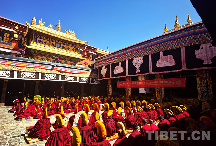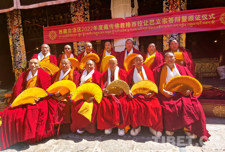 圖為(wei) 西藏自治區2022年度藏傳(chuan) 佛教學經僧人考核晉升格西拉讓巴學位立宗答辯暨頒證儀(yi) 式現場 攝影:拉姆