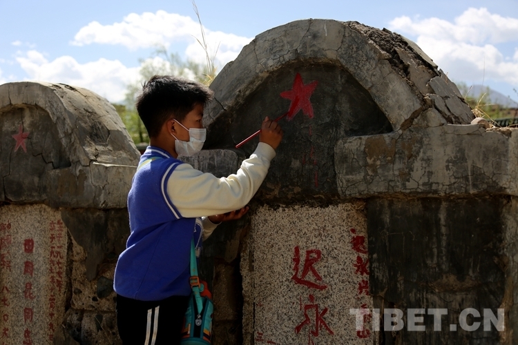 圖為(wei) 榮灝達瓦為(wei) 革命烈士墓碑上的紅星增添顏色 攝影:王佳豪