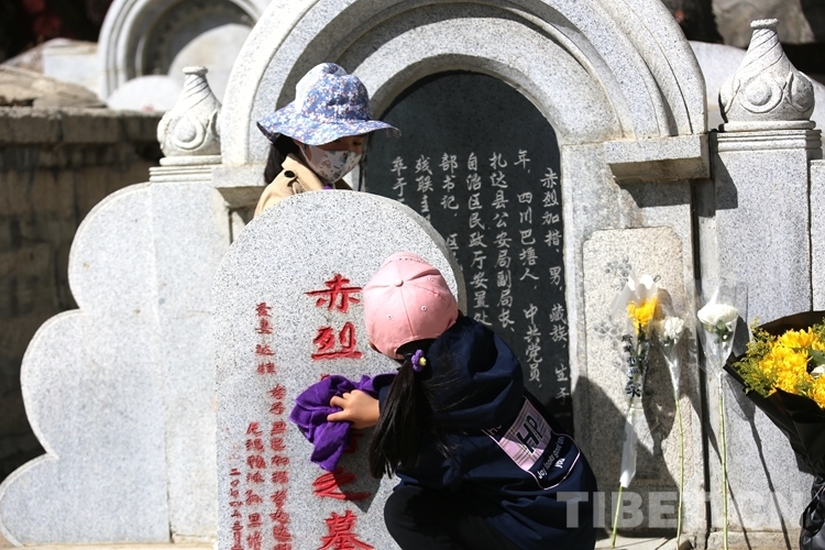 正在為(wei) 姐姐掃墓的薄永紅,看到兩(liang) 個(ge) 小女孩為(wei) 姐姐擦拭墓碑時感動不已,她說:“我的姐姐32歲就犧牲在了工作崗位上,我想她最想看到的就是像現在這樣,建設社會(hui) 主義(yi) 現代化強國、建設幸福美麗(li) 文明和諧新西藏後繼有人的場景。”