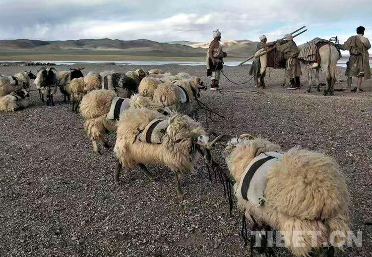 全部糧食馱上羊背後,最後將小帆布帳篷和簡單的生活用具馱在幾隻個(ge) 體(ti) 大、稱之為(wei) “羅布”(寶貝)的羊背上出發。“羅布”算是羊群中的幸運者,雖然背負的東(dong) 西體(ti) 積很大,也很重,但因是主人的生活用具,每天晚上都要卸下來使用,所以它們(men) 可以過背上沒有馱物的輕鬆夜晚。