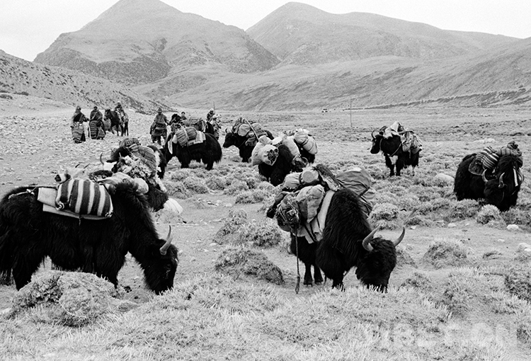 這是一支正在前往藏北無人區鹽湖馱運鹽巴的犛牛馱隊(唐召明1988年攝)
