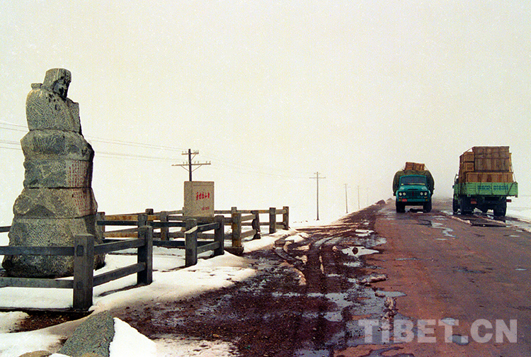 這是藏北高原替代牛羊運輸的汽車,正在通過青藏公路的唐古拉山口(唐召明1988年攝)