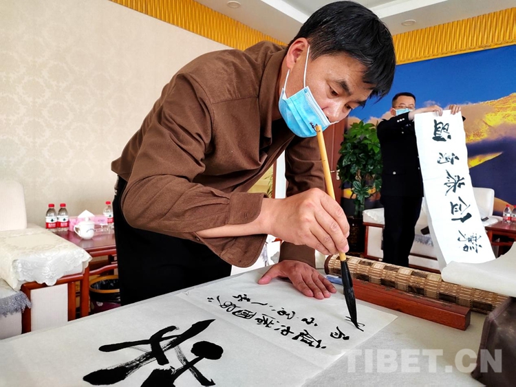 活動邀請的西藏自治區文聯3名書(shu) 法家在現場潑墨揮毫。在場民警們(men) 紛紛在佳作前駐足欣賞,細細品味,感受到了筆墨之美,並與(yu) 書(shu) 法家們(men) 麵對麵交流,虛心求教。此外,西藏自治區文聯贈送四幅書(shu) 法作品以示祝賀。