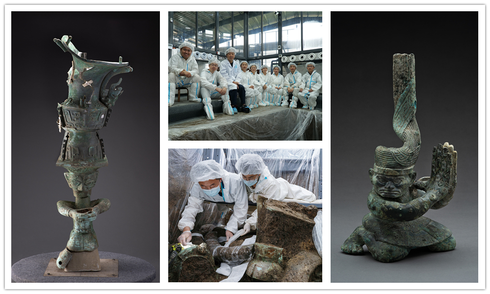 圖左為(wei) 三星堆遺址三號坑出土銅頂尊跪坐人像;圖中上為(wei) 部分發掘人員合影;圖中下為(wei) 象牙保護與(yu) 提取;圖右為(wei) 三星堆遺址四號坑出土扭頭跪坐銅人像 圖片來源:國家文物局