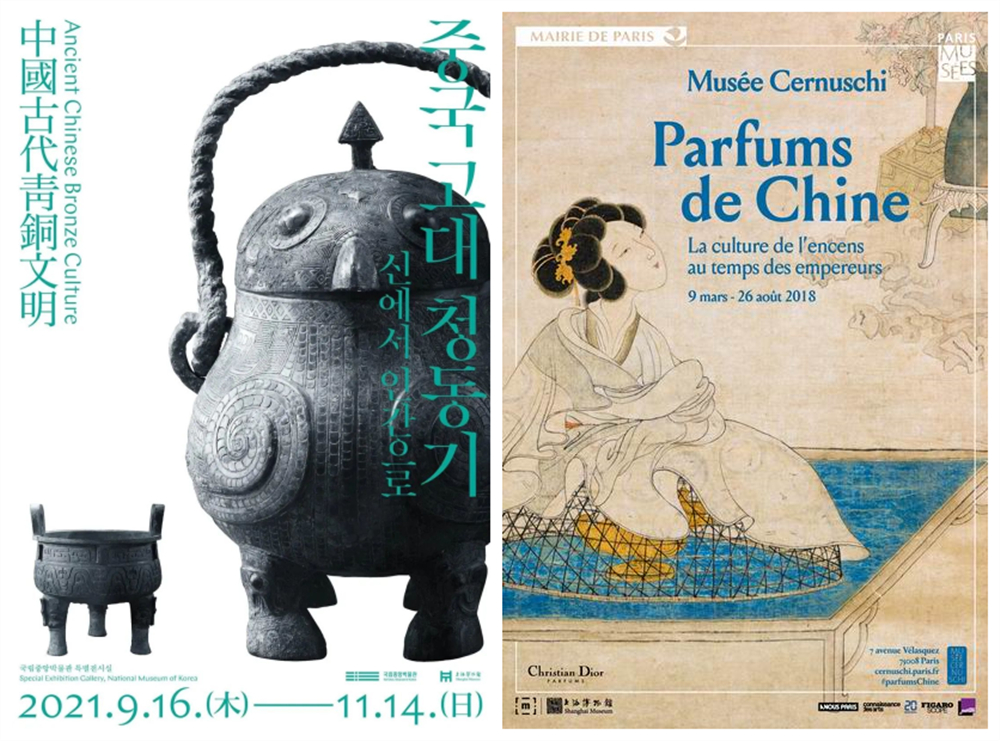 圖左為(wei) 2021年9月,上海博物館在韓國國立中央博物館舉(ju) 辦“中國古代青銅文明”特展海報;圖右為(wei) 2018年上海博物館在法國巴黎舉(ju) 辦的“中國芳香:古代中國的香文化”展覽海報 圖片來源:上海博物館
