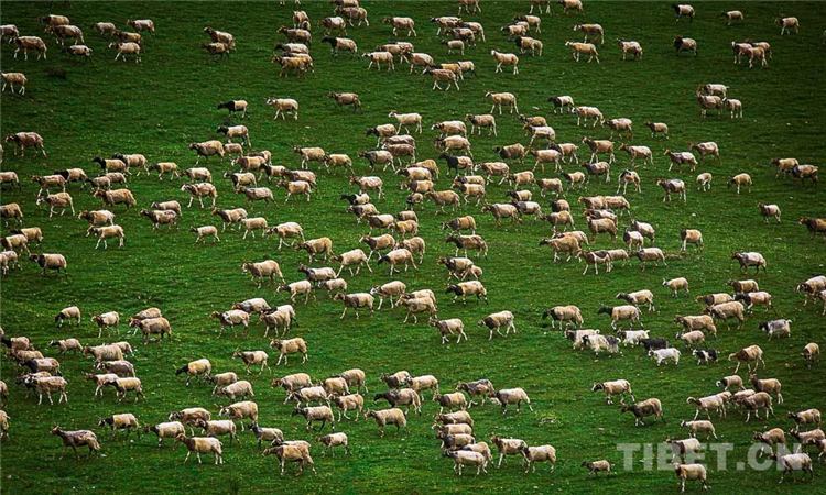 貢覺縣境內(nei) 山坡上的“阿旺綿羊”,其因體(ti) 型較大、肉質肥美、吃過不易上火而著名。攝影:趙耀
