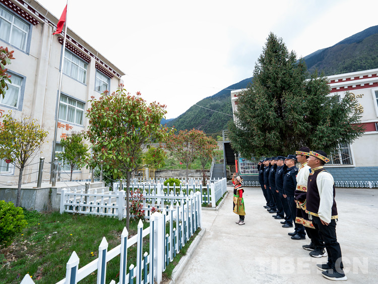 來自派鎮雪卡村的5歲小女孩旦增玉珍在林芝邊境管理支隊派邊境派出所,與(yu) 移民管理警察共同參加升旗儀(yi) 式。還在上幼兒(er) 園的她,像學校裏的哥哥姐姐們(men) 一樣,一邊敬禮一邊唱國歌,同派出所民警一起接受愛國主義(yi) 熏陶。
