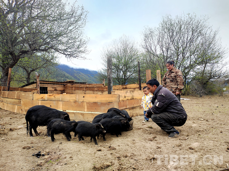 圖為(wei) 拉巴頓珠帶著老婆、孩子在喂豬 攝影:拉姆