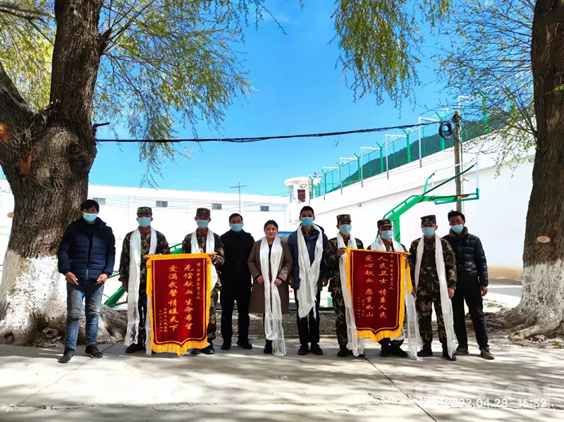 圖為(wei) 洛隆縣人民醫院為(wei) 光榮獻血的洛隆縣武警支隊官兵們(men) 送上錦旗