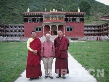 2004年9月3日,陳慶英先生在西藏自治區昌都市江達縣瓦拉寺調研,拍攝下大經堂外廊21幅《格薩爾》壁畫。其後將他在寺內(nei) 外所拍全部珍貴照片贈送作者,希望作者好好研究。圖為(wei) 陳老師與(yu) 瓦拉寺僧人合影。