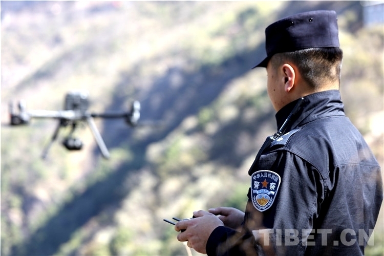 圖為(wei) 民警利用無人機對波曲河道兩(liang) 翼滑坡地段進行勘測 攝影:鄒興(xing) 國