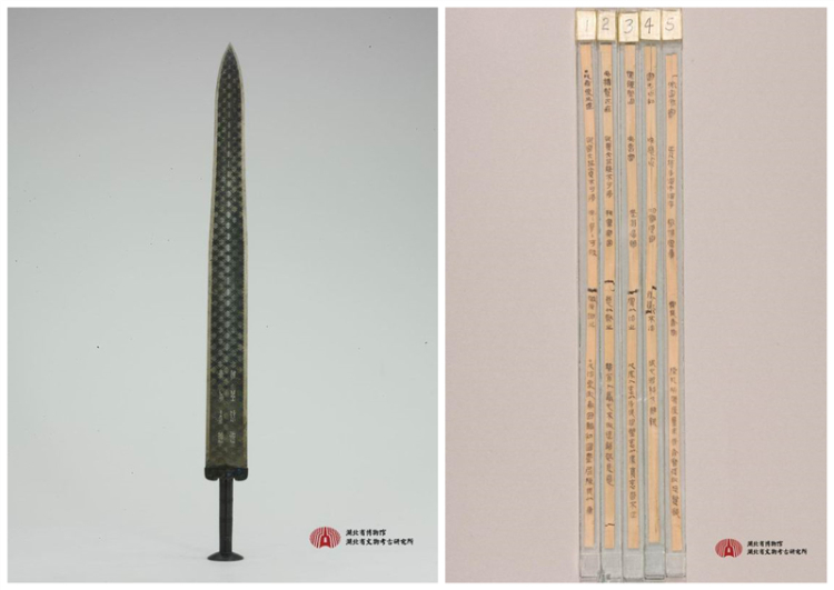 圖為(wei) 湖北省博物館的兩(liang) 件鎮館之寶:左為(wei) 曆經2500餘(yu) 年依然寒光閃閃、毫無鏽蝕的“天下第一劍”——越王勾踐劍,右為(wei) 雲(yun) 夢睡虎地秦簡 圖片來源:湖北省博物館網站