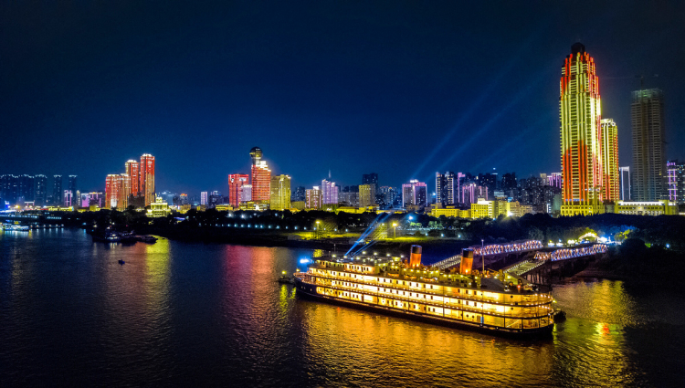 圖為(wei) 知音號遊船在武漢長江段瑰麗(li) 的夜景中暢行 圖片來源:知音號網站