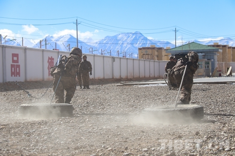 圖為(wei) 阿裏軍(jun) 分區某部官兵進行拉輪胎訓練