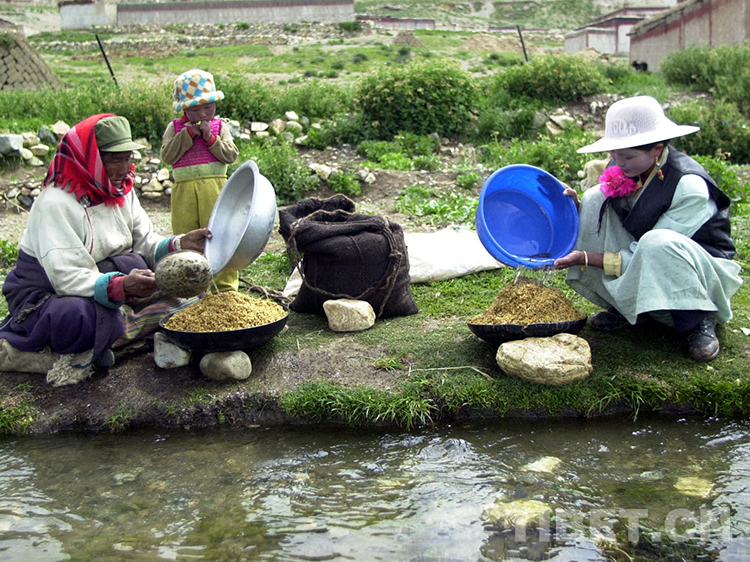 這是尼瑪縣文部鄉(xiang) 南村的藏族婦女在淘洗準備磨糌粑的青稞(唐召明2001年7月11日攝)