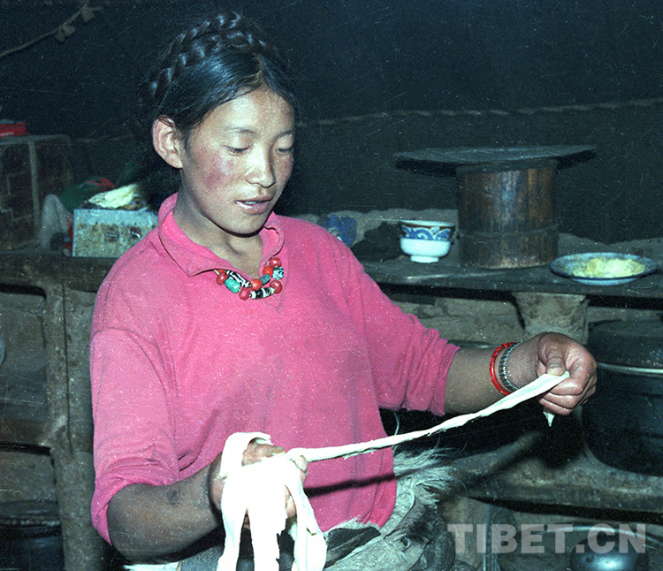 這是班戈縣一牧女正在製作“啦啦”奶酪(唐召明1987年攝)