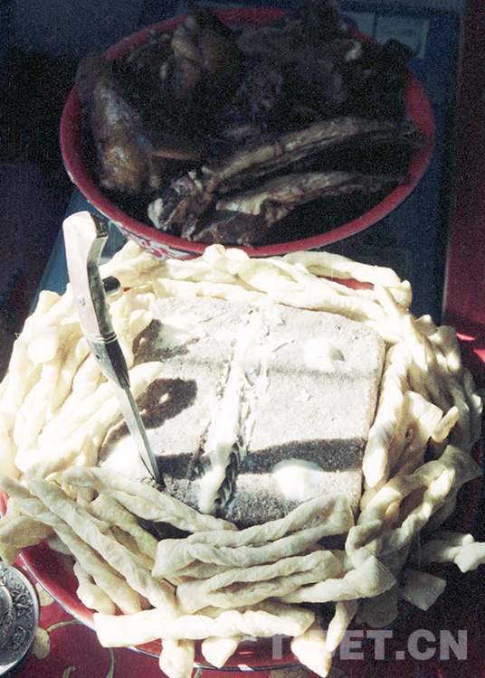 這是插著藏式小刀的藏北美食——“褪”和後麵盆裝的手抓羊肉(唐召明1989年攝)