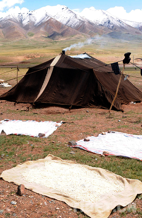 在藏北草原,夏天是犛牛產(chan) 奶旺季,牧民此時吃奶類食物比別的季節多。喝的奶大多是犛牛奶,其次為(wei) 綿羊奶和山羊奶。人們(men) 既喝鮮奶,也喝酸奶、吃奶渣。奶渣大多是拌糌粑時食用。