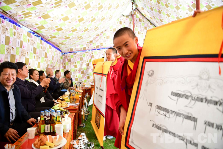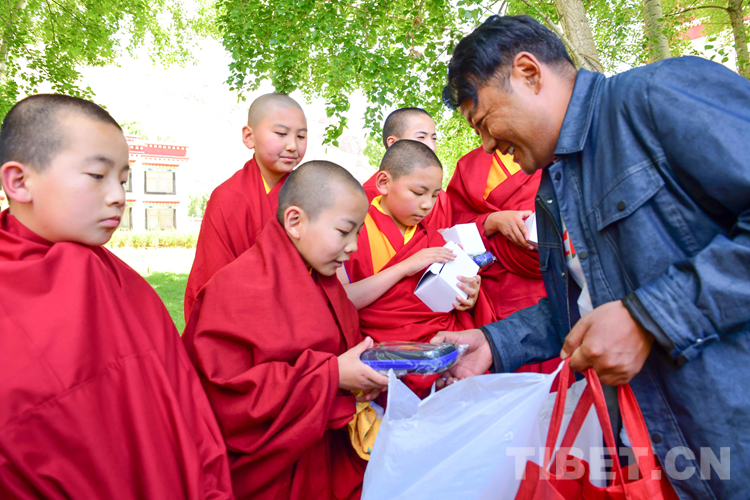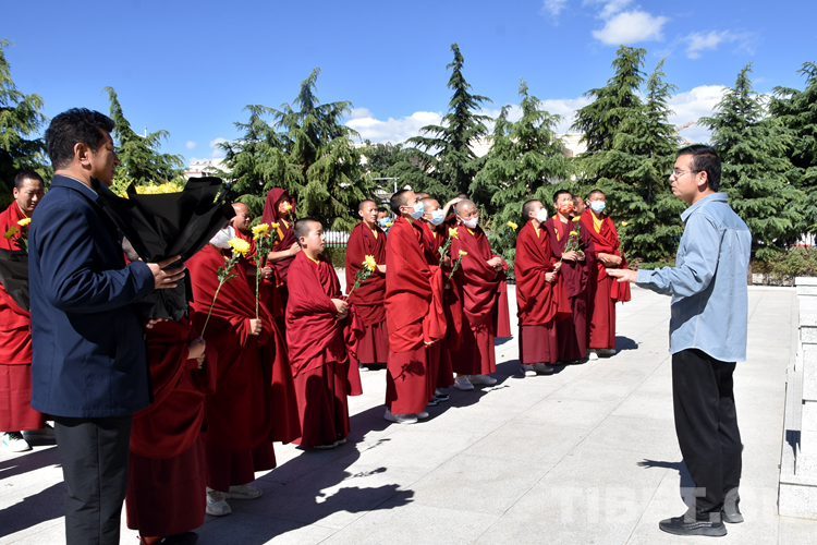 圖為(wei) 佛學院老師代表相關(guan) 單位向少年活佛贈送節日禮物 攝影:拉姆