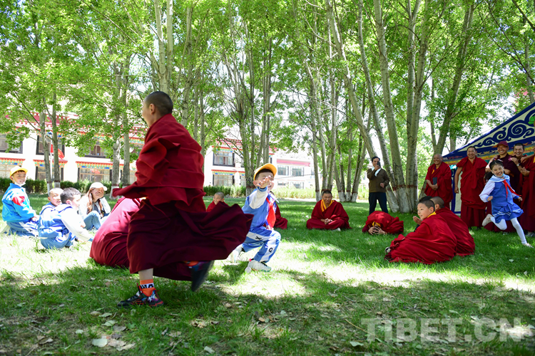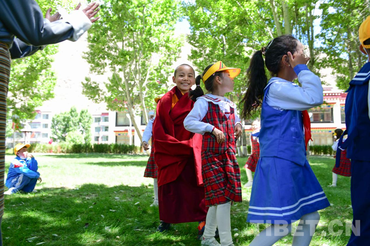 圖為(wei) 少年活佛與(yu) 拉薩市第一小學的學生一起做遊戲 攝影:拉姆