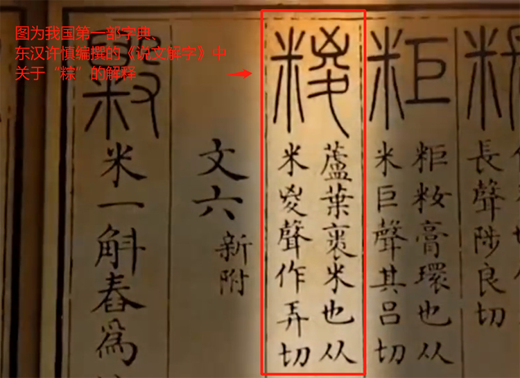 關(guan) 於(yu) 粽子,比較早的文字記載,在距今近2000年前,由東(dong) 漢學者許慎編纂的我國第一部真正意義(yi) 上的字典《說文解字》中可以找到——“糉,蘆葉裹米也”。這個(ge) 記載言簡意賅地說明了製作粽子的原料和方法。“糉”字就是我們(men) 現在使用的“粽”字。