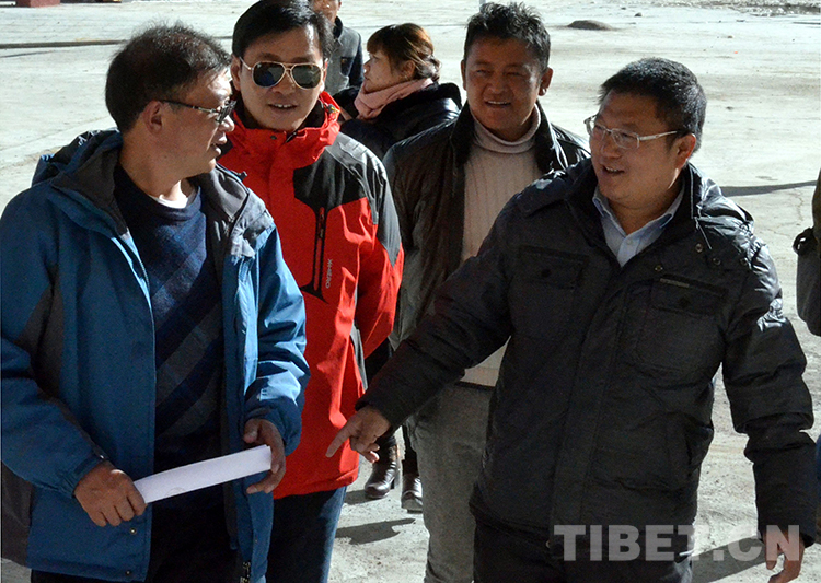 這是中國石化援藏幹部王鵬雁(右一)在中國石化小學二期工程驗收現場同其他縣領導進行交流(紮西2014年10月25日攝)