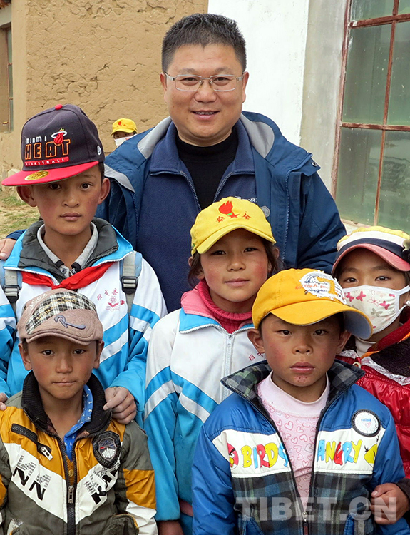 這是中國石化援藏幹部王鵬雁與(yu) 班戈縣小學的學生們(men) 合影留念(紮西2013年8月29日攝)