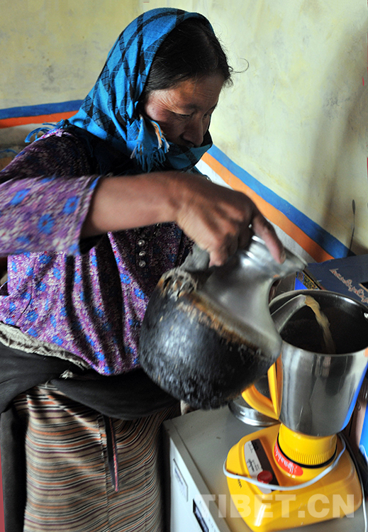 這是班戈縣新吉鄉(xiang) 術後的斯求卓瑪向放入酥油的電動攪拌壺裏倒茶水,準備用電來打製酥油茶(唐召明2015年7月14日攝)