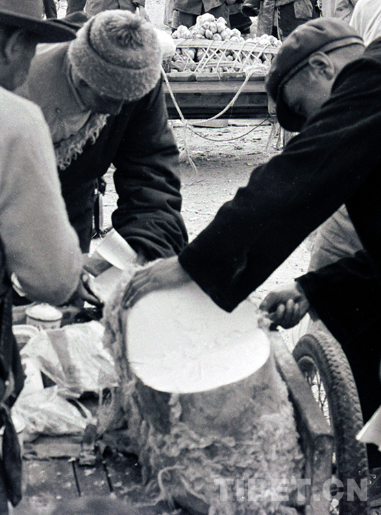 這是在藏北首府那曲鎮市場上,正在售賣的大坨酥油(唐召明1989年攝)