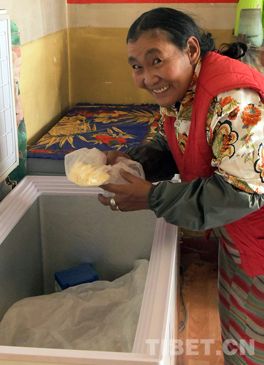 這是雙湖縣嘎措鄉(xiang) 牧女次仁朗加,使用家裏的冰櫃冷藏隨用隨取的酥油(唐召明2019年9月20日攝)