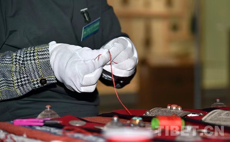圖為(wei) 西藏博物館工作人員正在縫製飾品 攝影:王媛媛