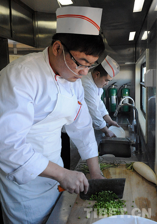 我在北京鐵路客運段京藏列車第二組的餐車裏看到,列車在通過唐古拉山區段時,餐車正在為(wei) 旅客提供炒菜服務。我采訪的廚師長孫冠軍(jun) 告訴我,京藏列車自開通運營以來,除了像西紅柿炒雞蛋因高原沸點低而無法炒成片外,其他三四十種可口飯菜都能在列車運行中的高海拔地段完成。