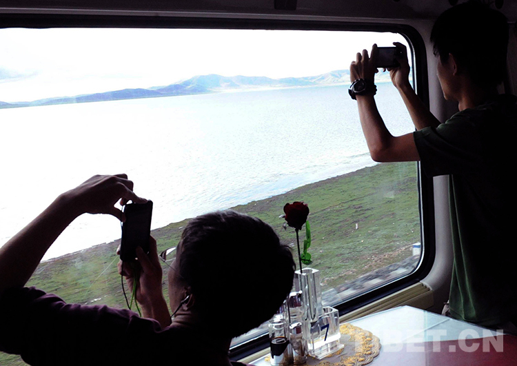 這是京藏列車在通過錯那湖時,旅客們(men) 紛紛用手機拍攝美景(唐召明2012年8月12日攝)