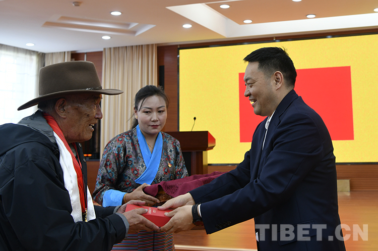 圖為(wei) 西藏自治區黨(dang) 委常委、統戰部部長,自治區政協黨(dang) 組副書(shu) 記、副主席嘎瑪澤登向“光榮在黨(dang) 50年”的老黨(dang) 員頓珠多吉頒發紀念章 攝影:王媛媛