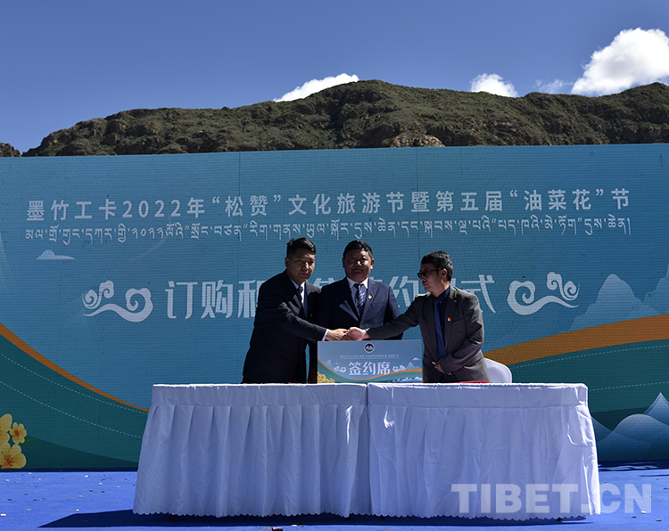 圖為(wei) 墨竹工卡縣鬆讚文化旅遊節暨第五屆油菜花節開幕式上,墨竹工卡縣農(nong) 牧業(ye) 淨土產(chan) 業(ye) 發展有限公司代表與(yu) 唐加鄉(xiang) 、紮西崗鄉(xiang) 分別簽訂認購、預售合同 攝影:王媛媛