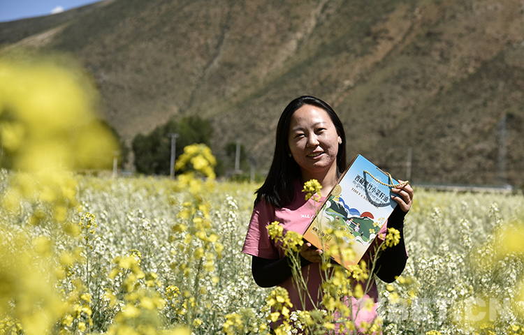 圖為(wei) 墨竹工卡縣鬆讚文化旅遊節暨第五屆油菜花節開幕式後,現場觀眾(zhong) 手捧有幸抽到的開幕式紀念品在油菜花海中留影 攝影:王媛媛