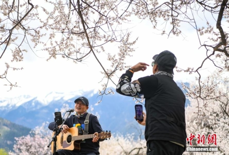 遊客在嘎拉村桃樹下唱歌 中新社 貢嘎來鬆/攝
