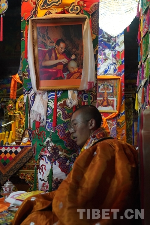 圖為(wei) 第六世德珠•加央西繞班旦,上方照片為(wei) 班禪額爾德尼•確吉傑布為(wei) 第六世德珠活佛剃度 攝影:王淑