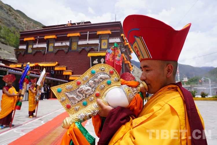 10時許,班禪抵達紮果寺。頓時,法號長鳴,鼓樂(le) 喧天,第六世德珠•加央西繞班旦活佛及僧眾(zhong) 以最隆重的宗教禮儀(yi) 歡迎班禪的到來。
