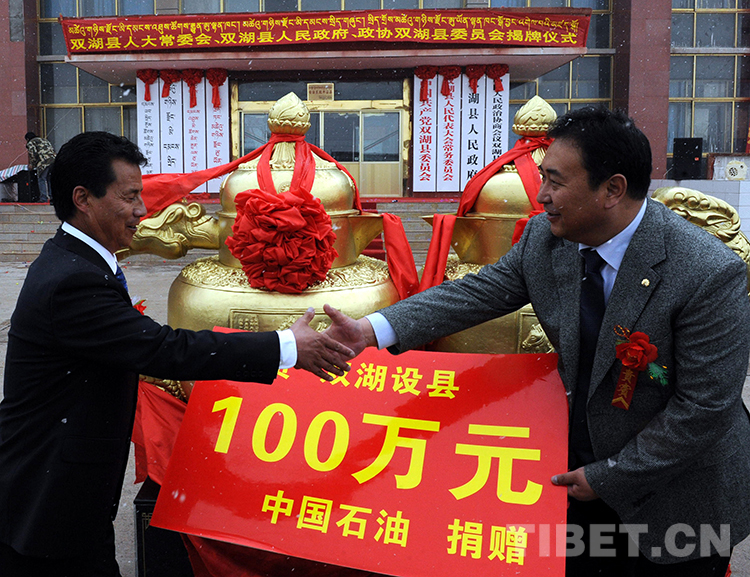這是對口援助單位的中國石油為(wei) 雙湖設縣捐贈100萬(wan) 元。經國務院批準,2013年7月26日,雙湖特別區“撤區建縣”正式掛牌(唐召明2013年7月26日攝)