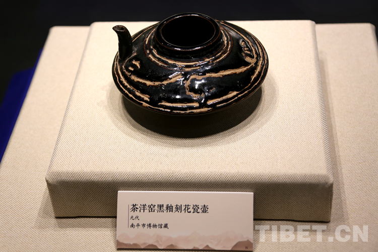 圖為(wei) “閩瓷雙璧·交相輝映——福建黑、白瓷器展”展出的茶洋窯黑釉刻花瓷壺 攝影:王佳豪