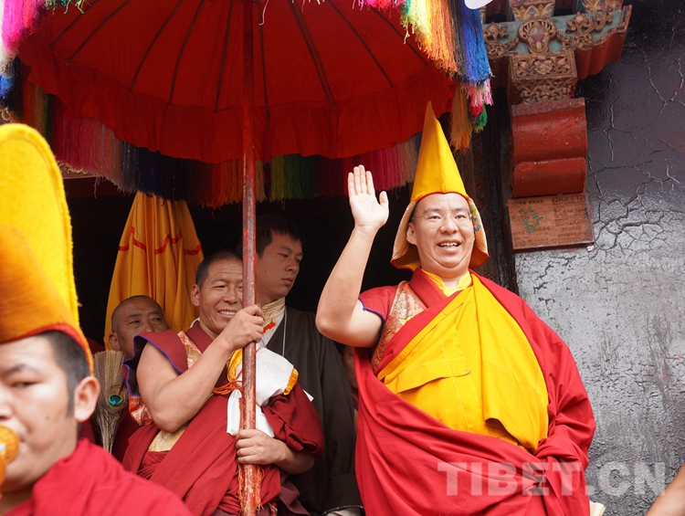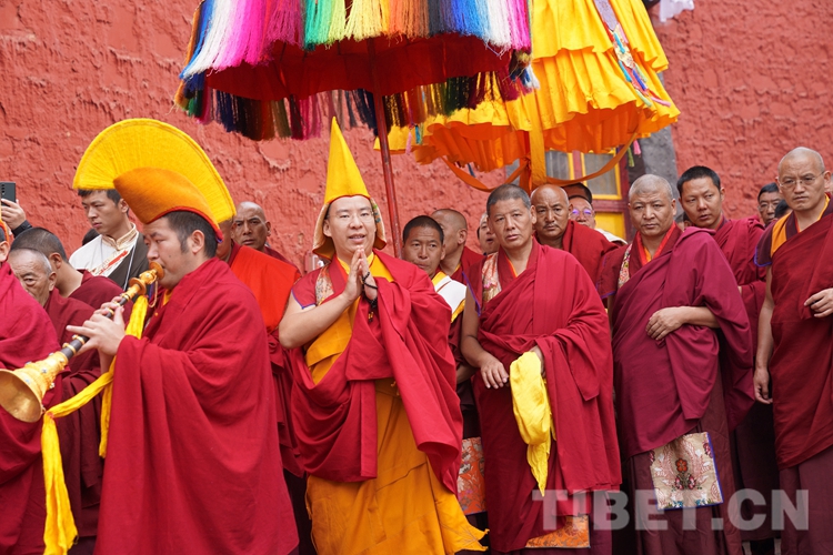 圖為(wei) 班禪在手持黃傘(san) 、香爐的高僧引領下緩緩步行入寺 攝影:王淑