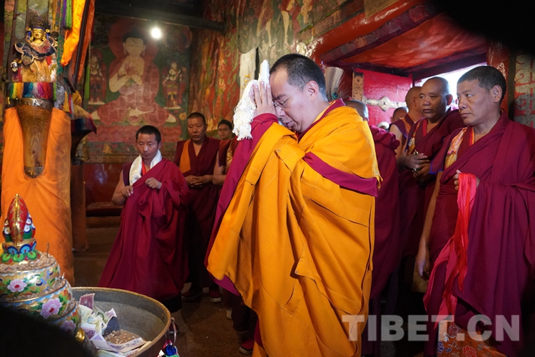 在措欽大殿,班禪虔誠叩拜供奉於(yu) 此的佛祖釋迦牟尼佛像和藏傳(chuan) 佛教格魯派始祖宗喀巴塑像,與(yu) 眾(zhong) 僧共同念誦經文後,回到寢宮拉讓殿。下午,班禪登上拉讓日光殿寶座,接受紮什倫(lun) 布寺管委會(hui) 僧人成員、高僧朝拜,並為(wei) 他們(men) 摸頂賜福,帶領高僧誦經祈福。