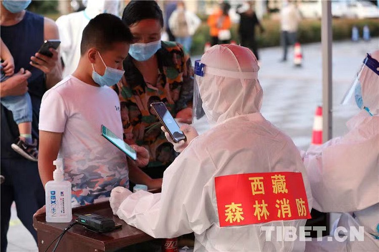 圖為(wei) 西藏自治區林芝市森林消防支隊消防員在核酸采集點查看群眾(zhong) 健康碼