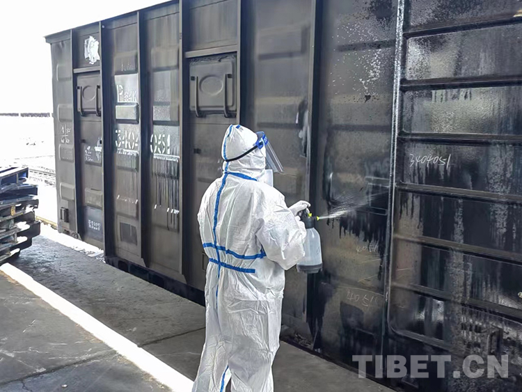 圖為(wei) 拉薩車務段工作人員對到站物資進行消殺